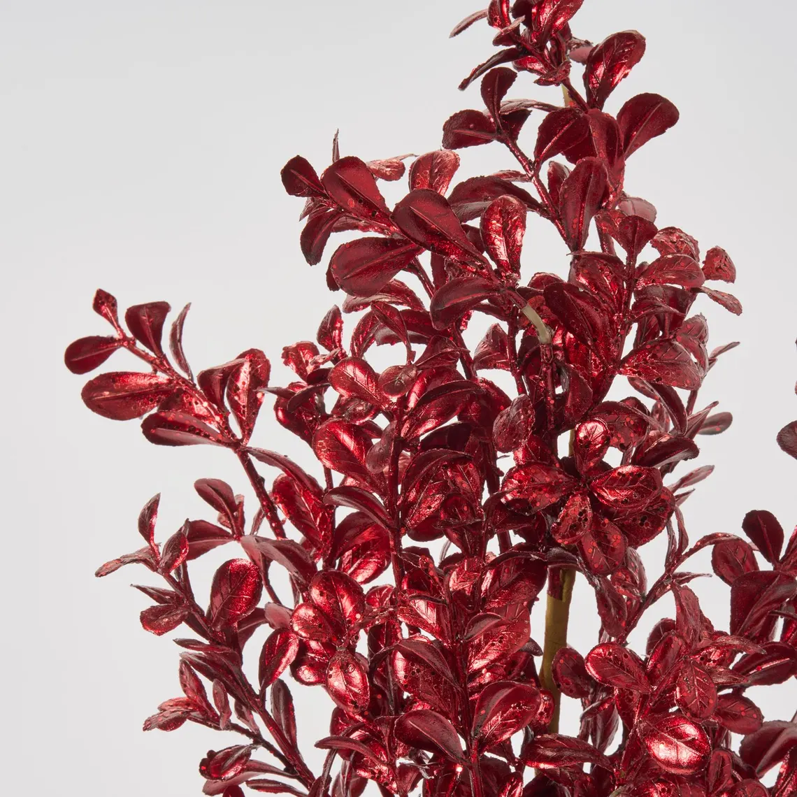 - Enhance the appearance of your home or event décor by creating an over-the-top holiday table centerpiece or Christmas arrangement with this chic red boxwood spray. The beautiful metallic color makes it a unique conversation piece that will be admired for years to come. For an elevated holiday arrangement, showcase a single boxwood stem alone in your favorite vase. Or, create a timeless and practical display when you purchase more than one stem and feature it in one of Darby Creek Trading’s glass containers, vases, or vessels.